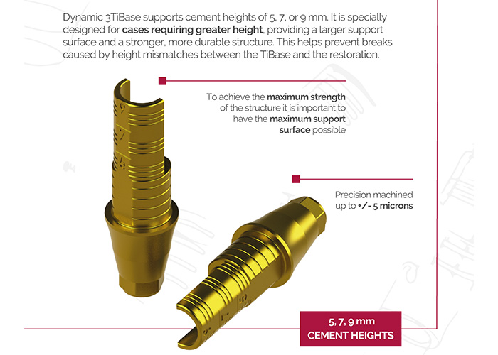 ¿Necesita más altura en tus restauraciones? Dynamic 3TiBase te permite elegir entre alturas de cemento de 5, 7 o 9 mm para un ajuste perfecto. – Mayor superficie de apoyo. – Mayor resistencia estructural. – Se acabaron las fracturas por desajustes de altura. Diseñado para casos exigentes y fabricado para durar.