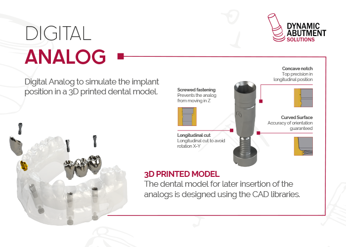 Réplica digital para simular la posición del implante en un modelo dental impreso en 3D. – Fijación atornillada: Evita que el análogo se mueva en Z – Corte longitudinal: Corte longitudinal para evitar la rotación X-Y – Muesca cóncava: Máxima precisión en posición longitudinal – Superficie curvada: Precisión de orientación garantizada El modelo dental para la posterior inserción de los …