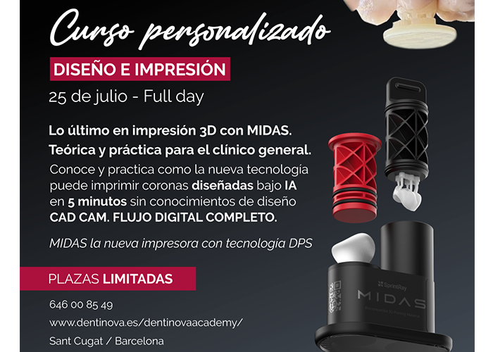 Conoceremos y practicaremos como la nueva tecnología puede imprimir coronas diseñadas con IA en tan solo 5 minutos. Si estas interesado, solo tienes que inscribirte a través de la web de Dentinova o llamando al 646 00 85 49. 25 de julio San Cugat, Barcelona