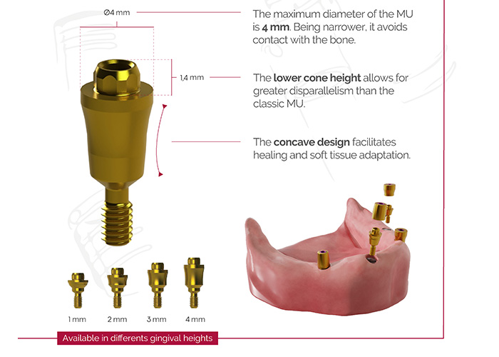 Nuestros Multi-Unit recto está diseñado para rehabilitar desde un solo diente o arcadas parciales o totalmente edéntulas. Además, su diámetro máximo es de 4 mm lo que evita el contacto directo con el hueso. ¿Por qué elegir nuestro Multi Unit? – Una menor altura del cono. – Permite un mayor disparalelismo que el Mu clásico. – Diseño cóncavo, facilitando la …