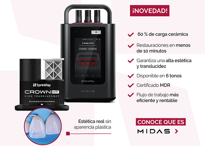 Midas combina estereolitografía de prensa digital (DPS) y un sistema de cápsulas innovador para producir coronas, inlays, onlays y carillas tan fácil como preparar un café. – Velocidad: Imprime hasta 3 coronas, 6 inlays/onlays o 9 carillas en menos de 10 minutos. – Simplicidad: Guía intuitiva desde el escaneo hasta la fabricación; fácil de usar, limpiar y mantener. – Innovación: …